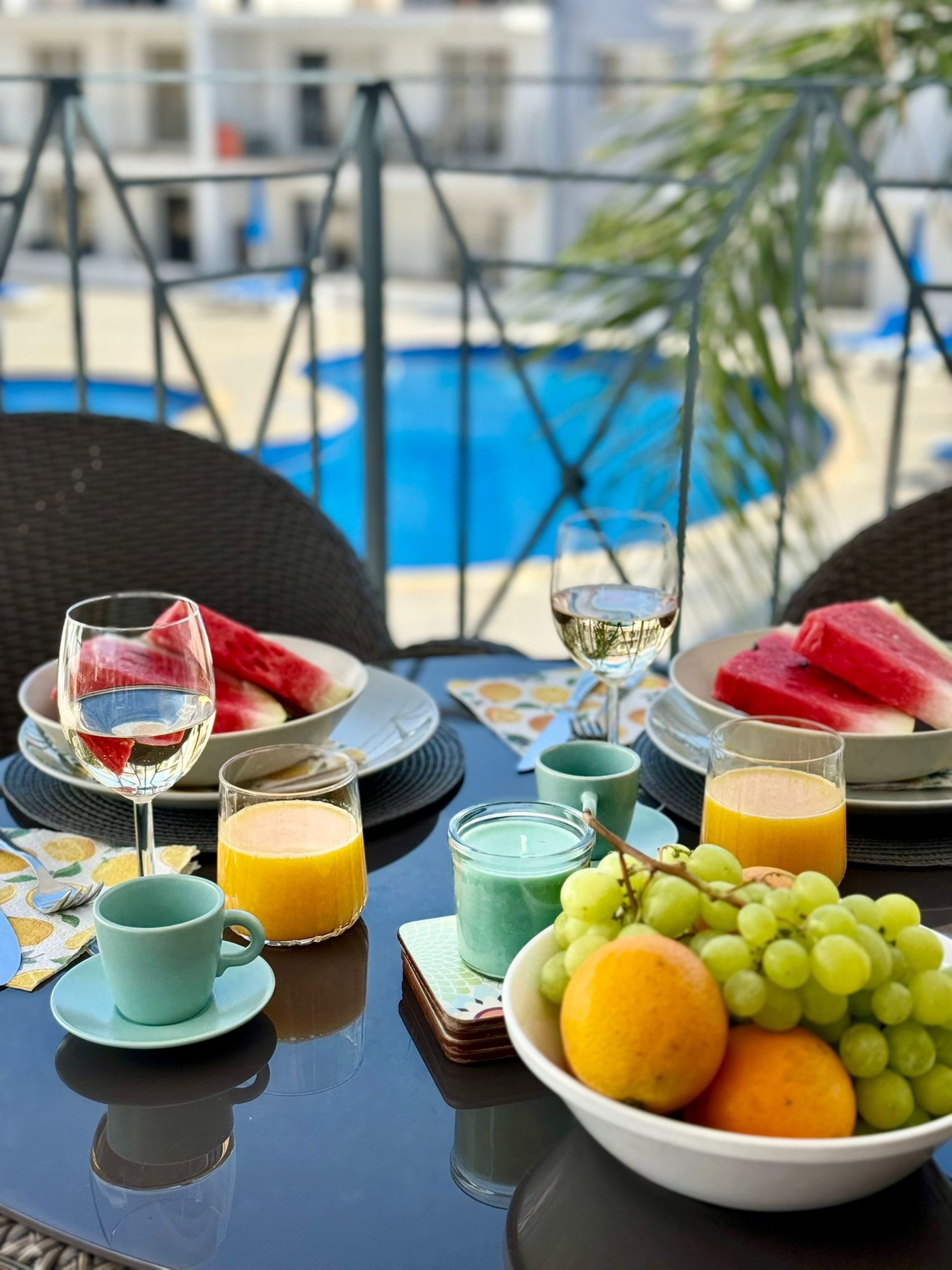 In the common areas there are great swimming pools, one classic and the other for small children with an outdoor shower. You can also relax on our large balcony or by the pools on sun loungers.