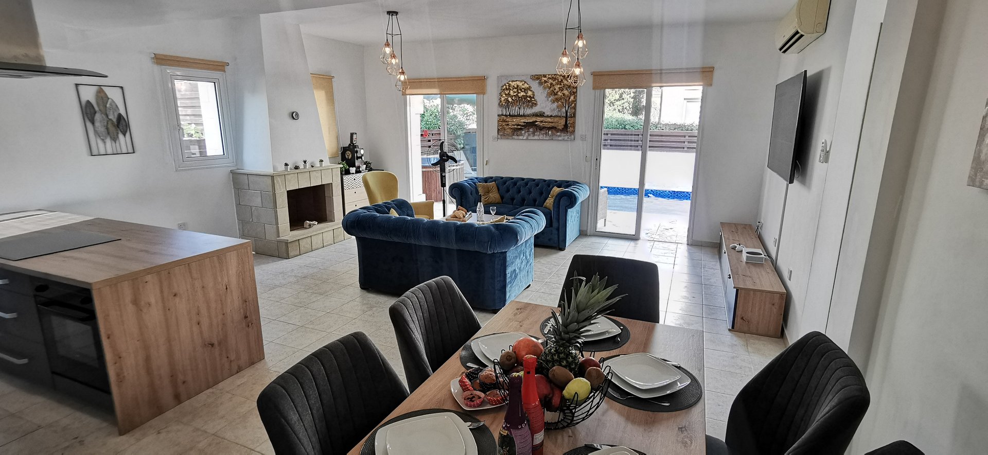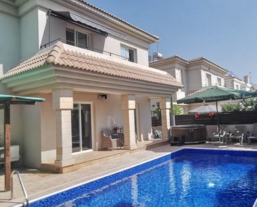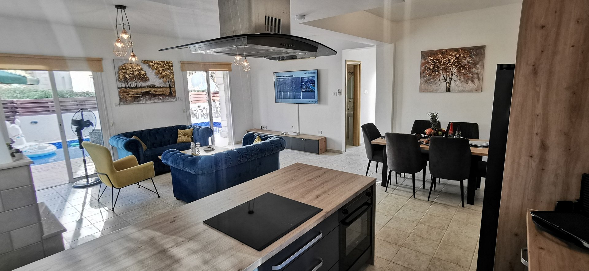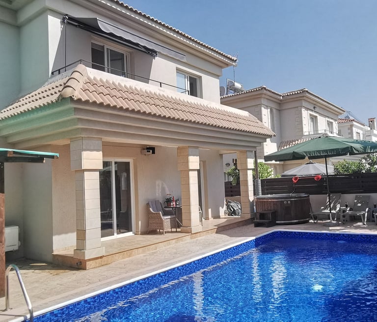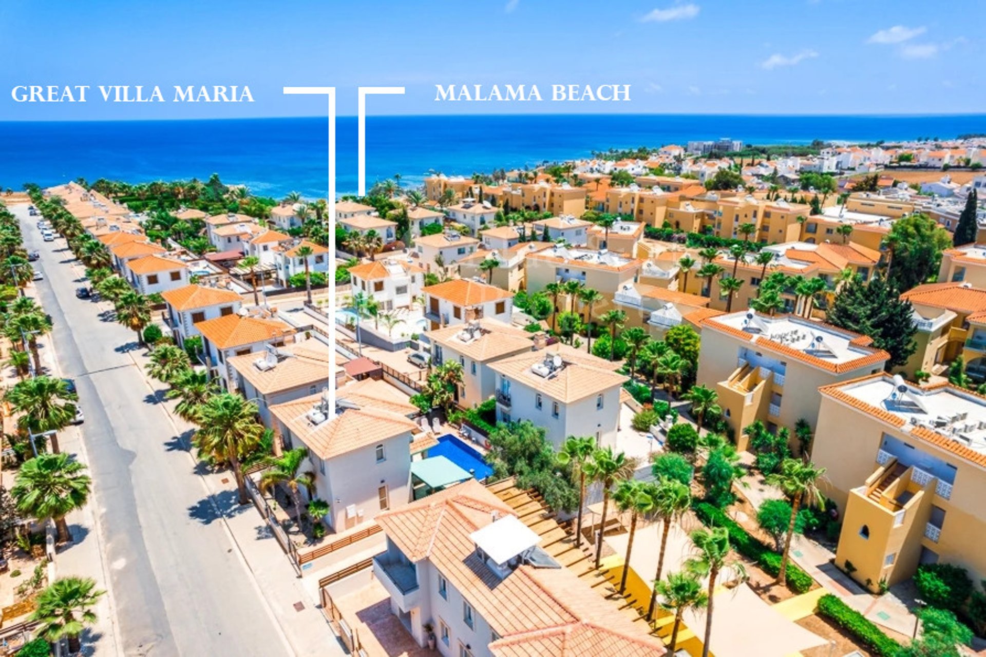 GREAT VILLA MARIA is located in Protaras Area in Kapparis. There are several sandy beaches within walking distance. The nearest beach is at the end of the street, it is the sandy Malama beach with a restaurant, which hosts various concerts of local artists and theme dinners during the season. On the other side of the street there are top restaurants and shops open all year round.