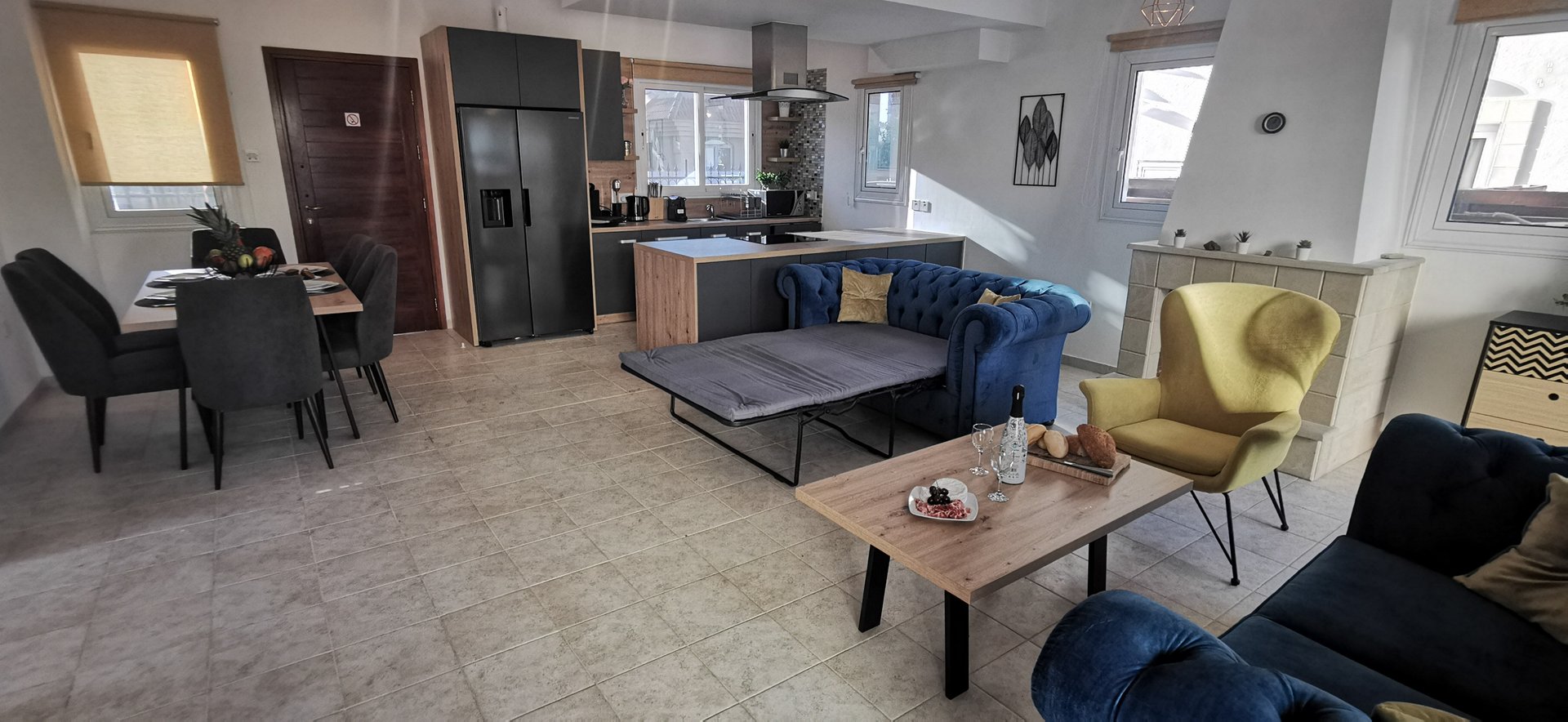 The villa has 3 bedrooms and two quality sofas (each with a 120cm mattress) for 2 people. In total, the house accommodates a maximum of 8 people plus a child up to two years old in a cot, which is available to guests. All rooms are equipped with air conditioning, so you will feel comfortable in summer and winter.