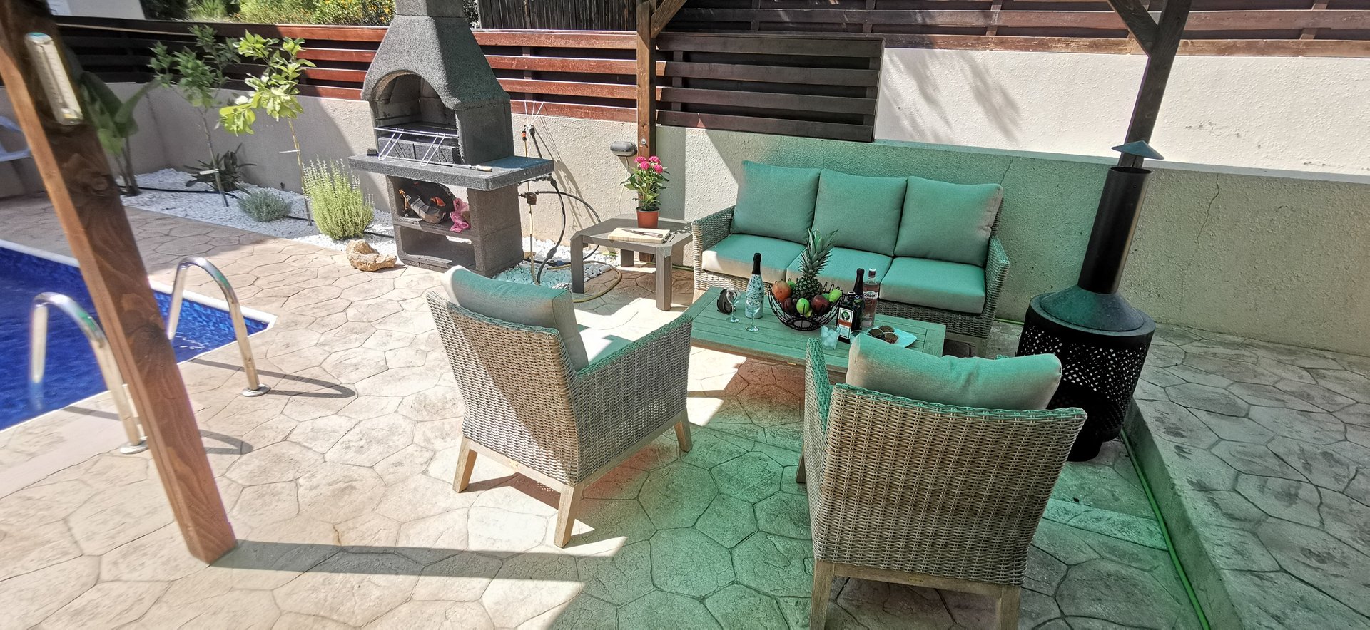 The main feature of the outdoor area is the pool and hot tub.The pool is 8m x 4m, everyone will definitely enjoy it to the fullest, especially children.For pleasant moments there is a hot tub more than 2 meters long.