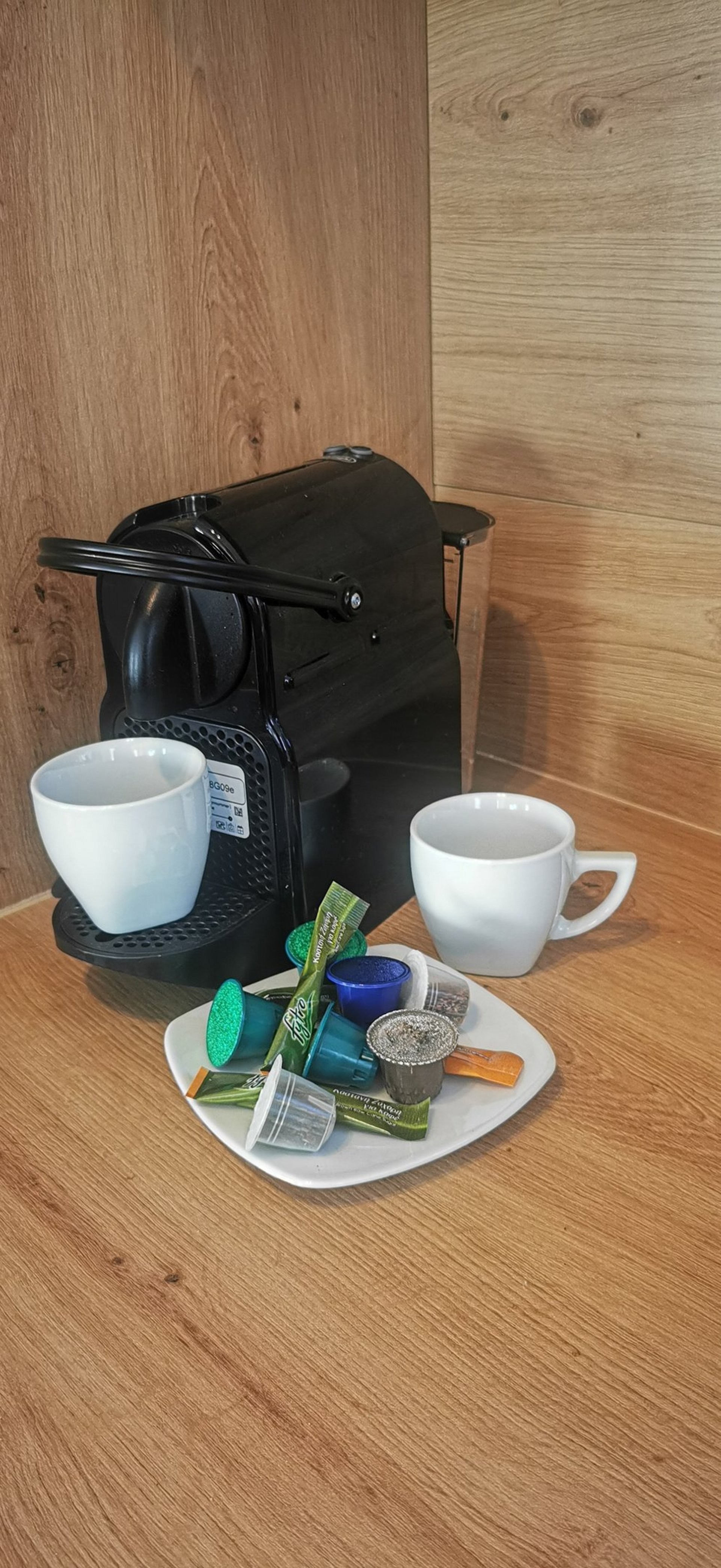 Modern, high-quality kitchen equipped with a microwave, toaster, frappe machine, dishes, cutlery, pans, pots, dishwasher, washing machine, electric grill, Nespresso capsule coffee maker, induction hob for rapid heating, kettle, Jägermeister drink cooler, double-door American refrigerator, Water dispenser.