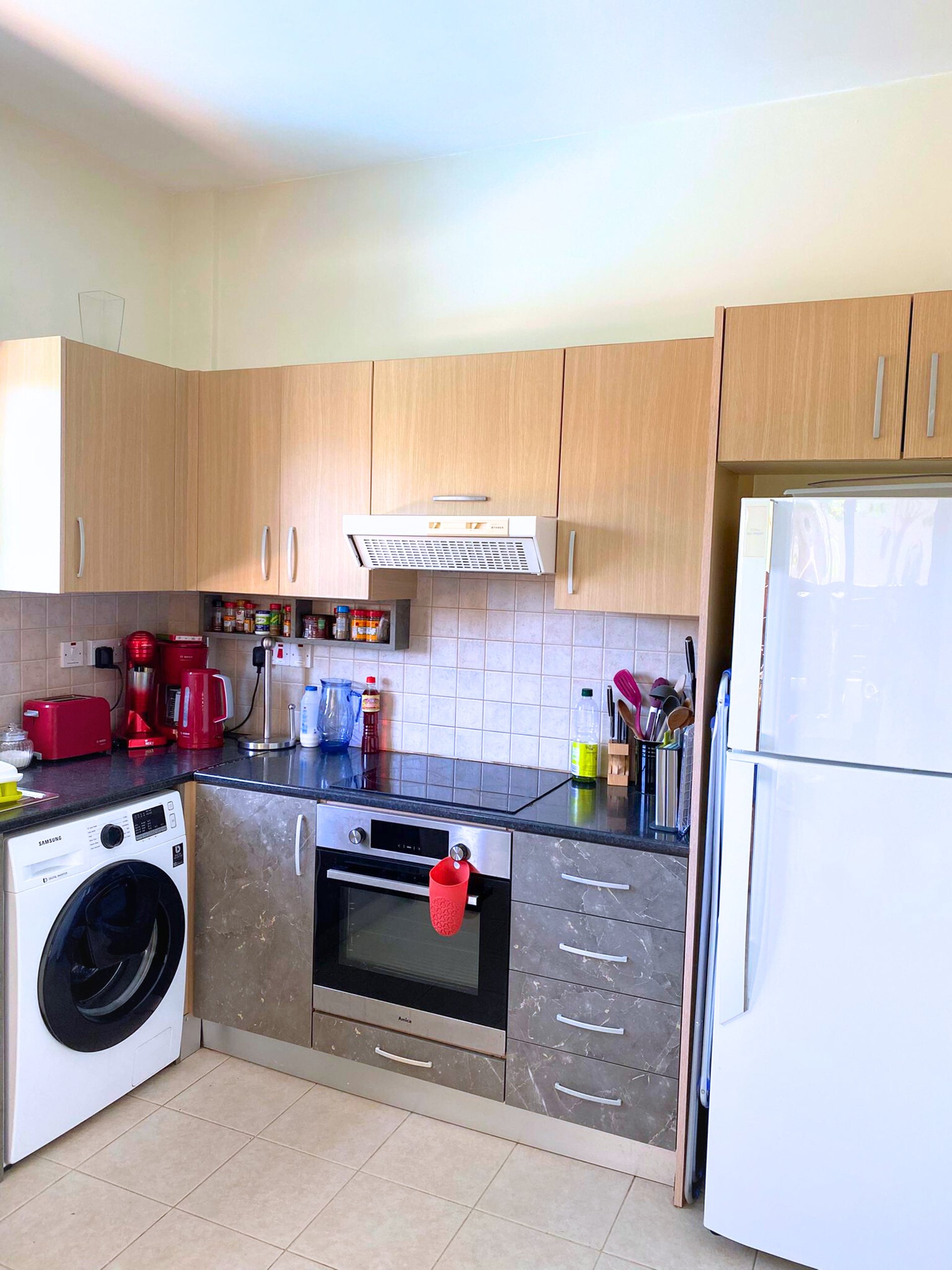 Quality kitchen equipped with a microwave, toaster, frappe machine, dishes, cutlery, pans, pots, dishwasher, washing machine, coffee maker, hob, kettle, refrigerator